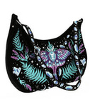 Gotyki, szkolny plecak z fazami księżyca, lawendą, ćmą i kryształami. Misterne hafty i bogate, wyszywane zdobienia. Wykonany z aksamitu i wzbogacono dwoma, dużymi kieszeniami bocznymi. Detale, rzemienie, splecione na wzór warkocza. 37 cm x 25 cm x 14 cm